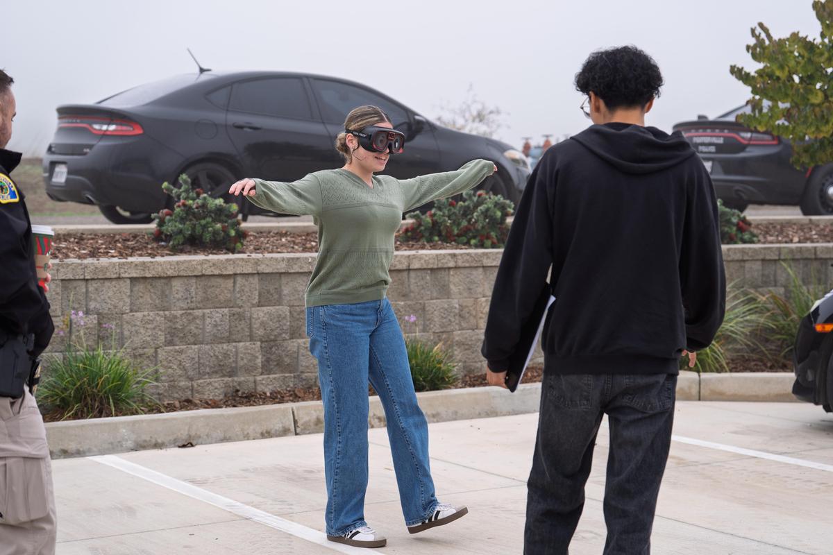 The actors use “drunk goggles,” which simulate the visual distortion and loss of coordination associated with intoxication. This allows students to conduct field sobriety tests with realism while also seeing firsthand how impairment affects a driver’s ability to follow directions.
